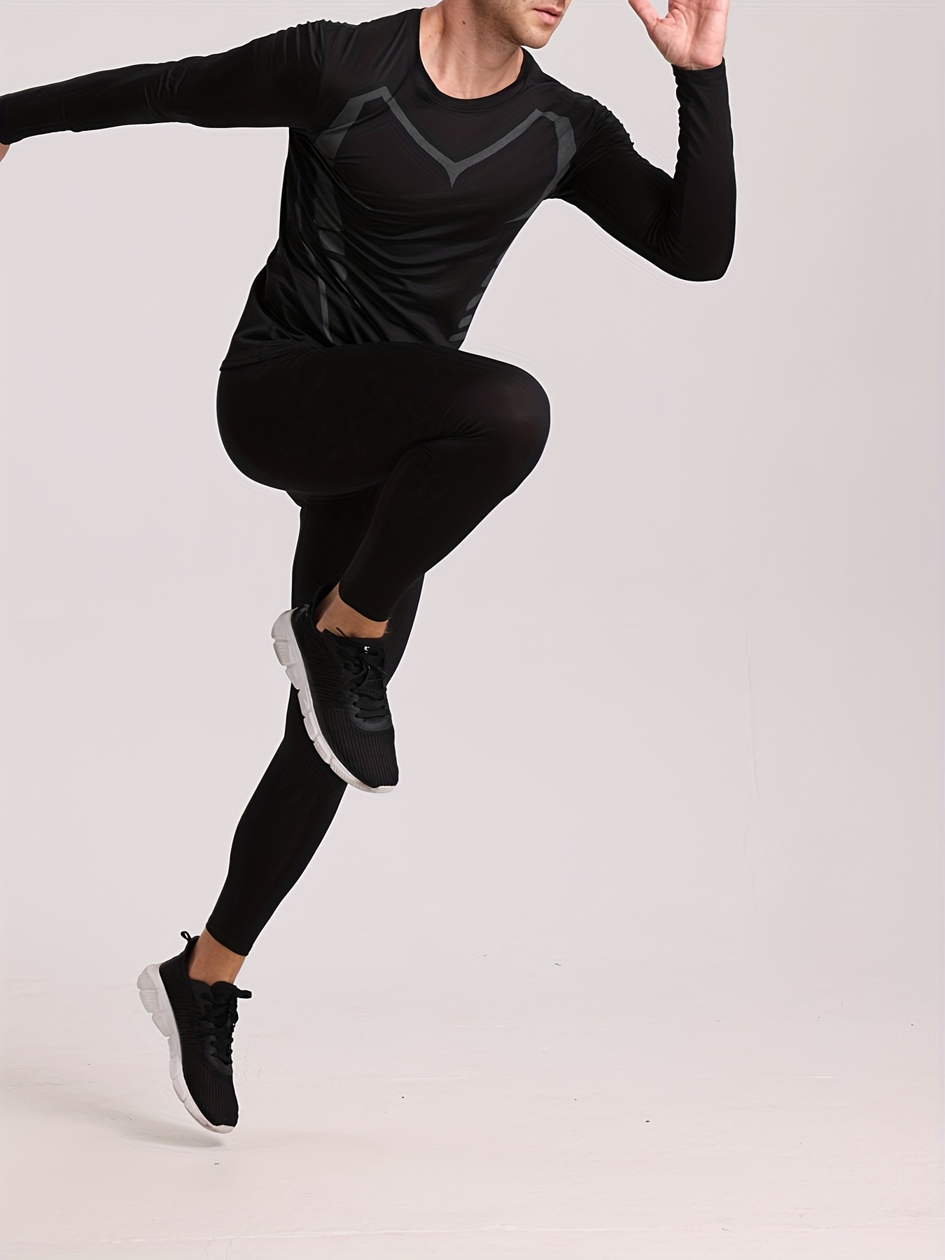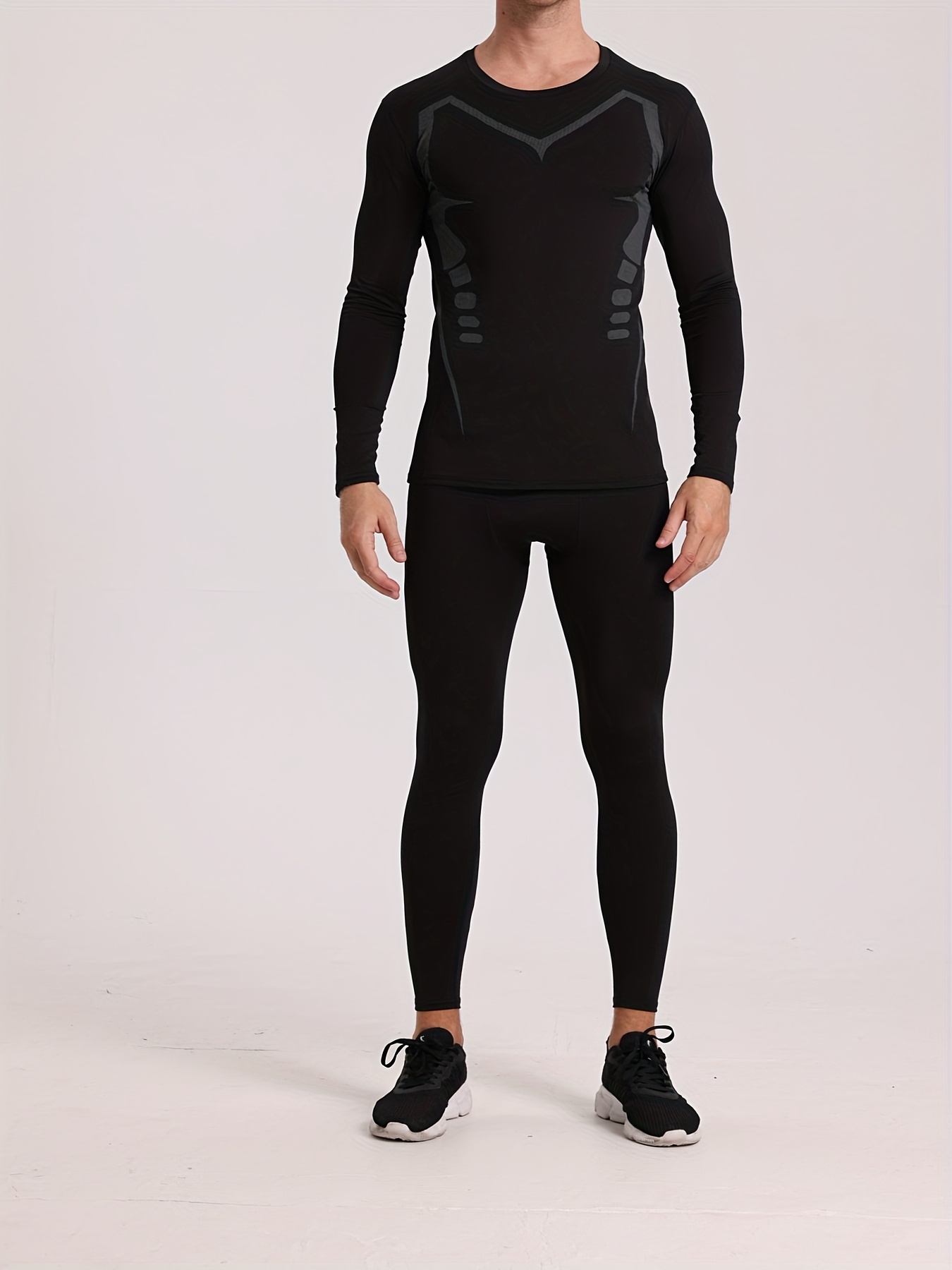 Men'S Two-Piece Fitness Set, Featuring Elastic Quick-Dry Training Wear, a Print Long-Sleeve Top Paired with Long Pants, Suitable for Gym Workouts, Basketball, Running, Body Shaping, Outdoor Jogging, Cycling, Hiking, Night Run
